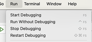 In the Configure menu, select the compiler to use. Above the selection is Clang for an Apple silicon Mac. Then, instead of using the menu items to build, run, and debug, use the buttons at the bottom of the screen, which look like this:
