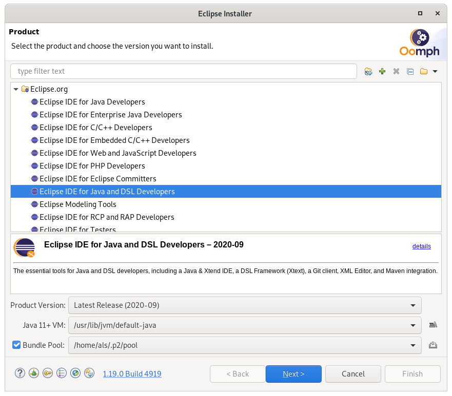 4. Oomph now wants you to select the base Eclipse distribution for your development. We recommend to use "Eclipse IDE for Java and DSL Developers". As product version we recommend to use "Latest Release (...)".