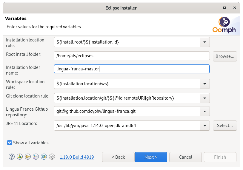 7. Now you can further configure where and how your development Eclipse should be created. Check "Show all variables" to enable all possible configuration options. You can hover over the field labels to get a more detailed explanation of their effects.