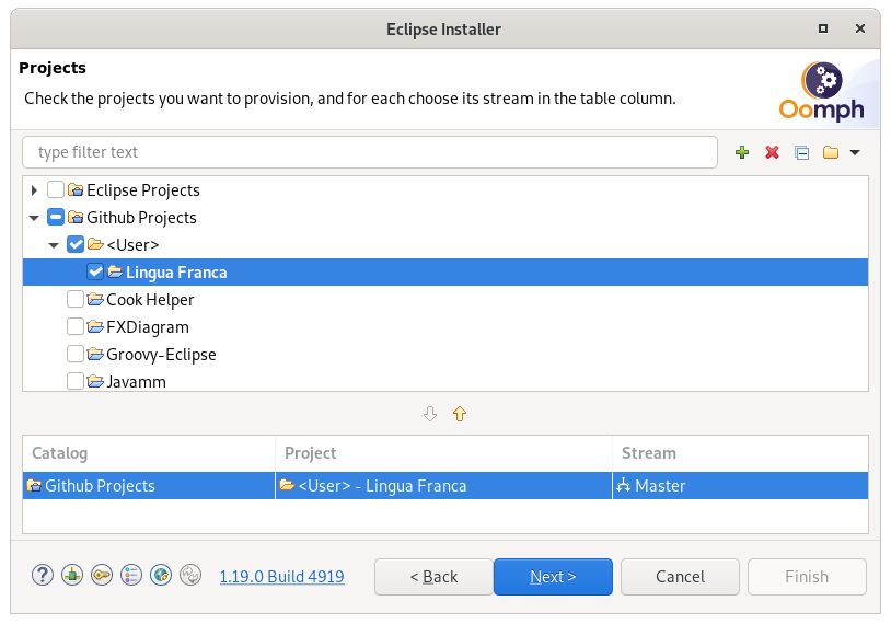 6. Now Oomph lists the Lingua Franca setup in the "<User>" directory of the "GitHub Projects" catalog. Check the Lingua Franca entry. A new entry for Lingua Franca will appear in the table at the bottom of the window. Select Lingua Franca and click Next.