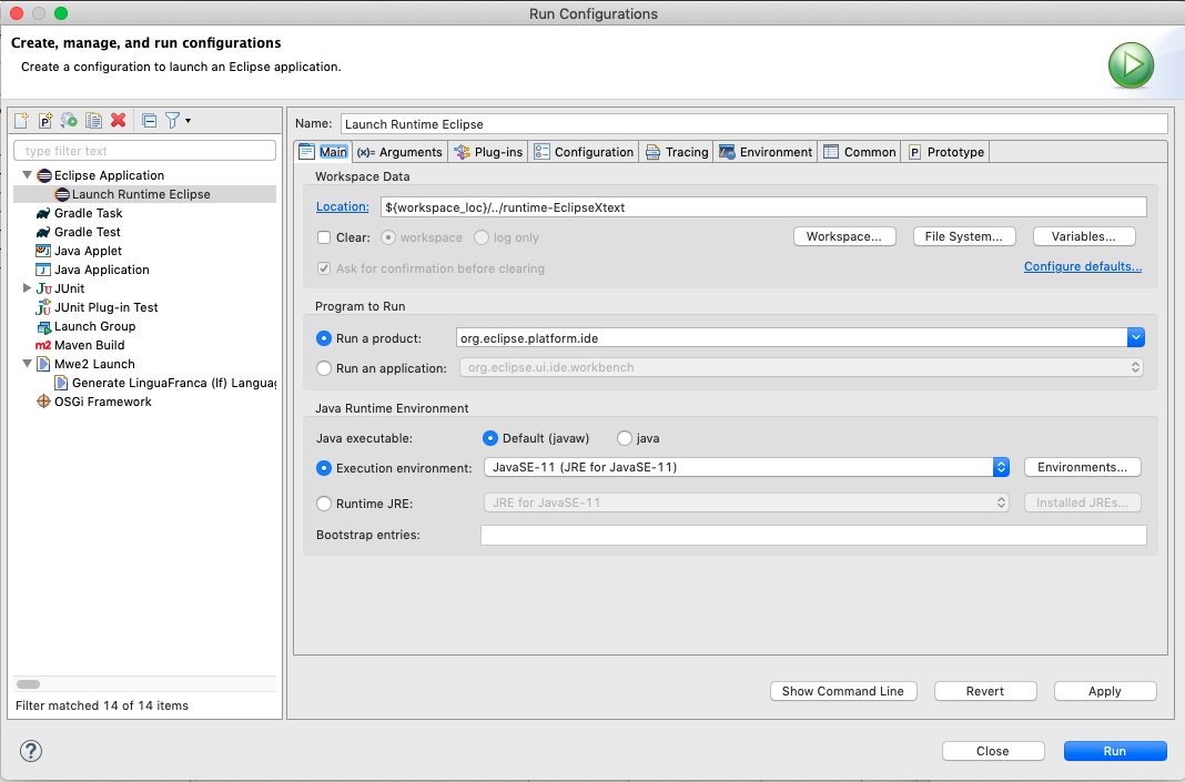 5. When the setup dialog is closed, your LF development IDE is ready. Probably, Eclipse is still compiling some code but when this is finished as well, all error markers on the project should have disappeared. Now, you can start a runtime Eclipse to test the actual Lingua Franca end-user IDE. In the toolbar, click on the small arrow next to the green Start button. There may already be an entry named "Launch Runtime Eclipse", but probably not. To create it, click on "Run Configurations...". Expand the "Eclipse Application" entry, select "Launch Runtime Eclipse", as follows: