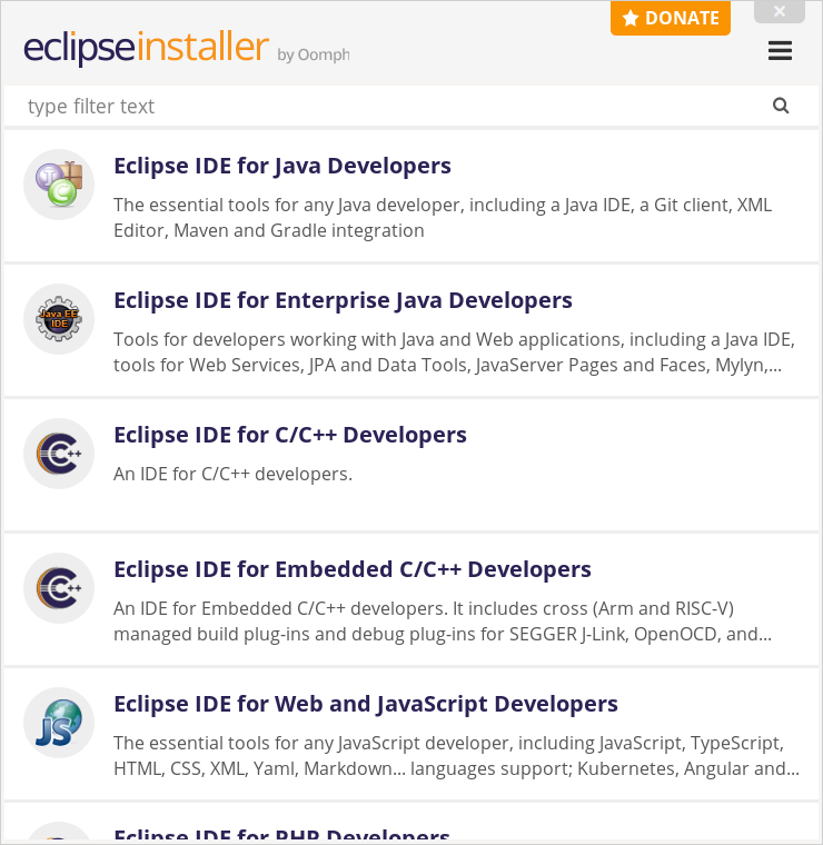 1. Go to the Eclipse download site (https://www.eclipse.org/downloads/index.php) and download the Eclipse Installer for your platform. The site does not advertise that it ships the Oomph Eclipse Installer but downloading Eclipse with the orange download button will give you the installer.