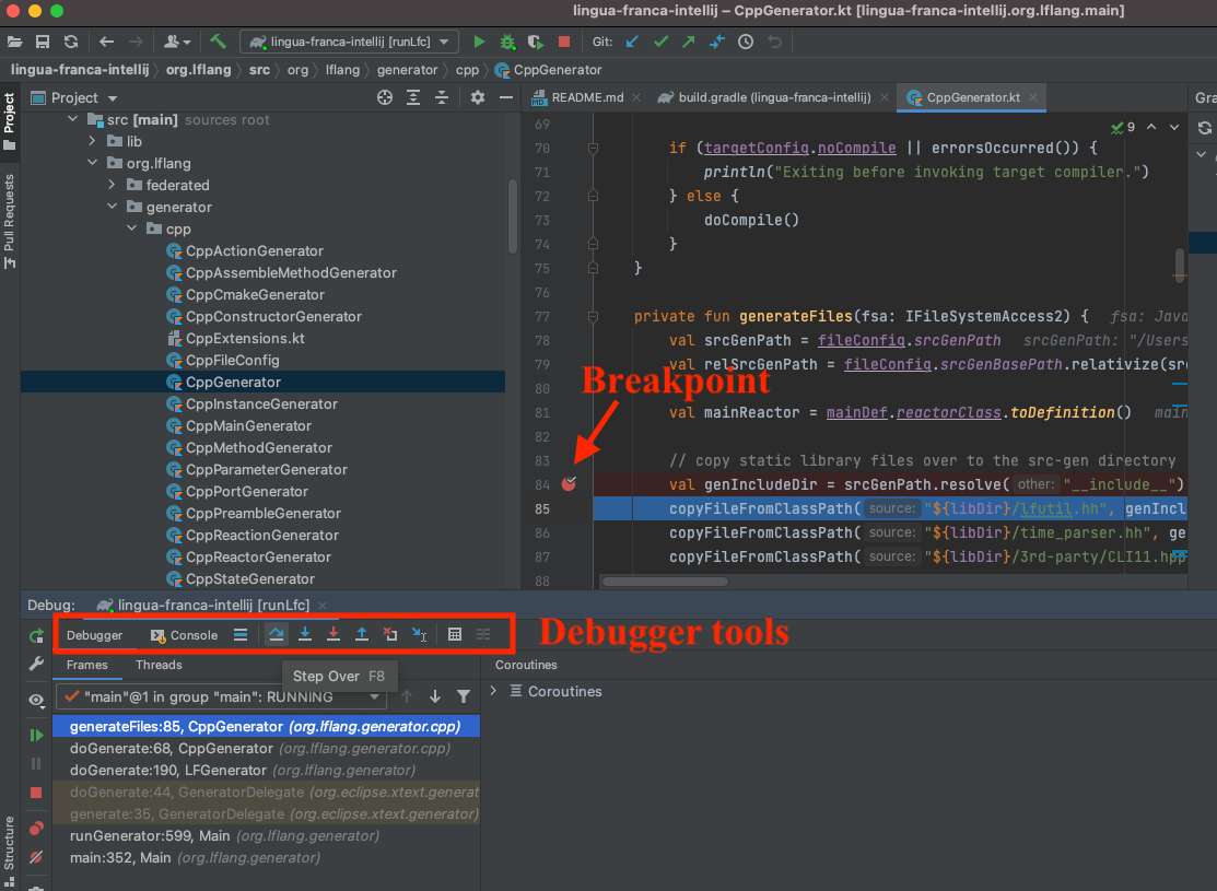 Using the newly added config, you can run and debug the code generator by clicking the play button and the debug button.