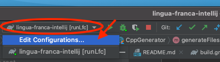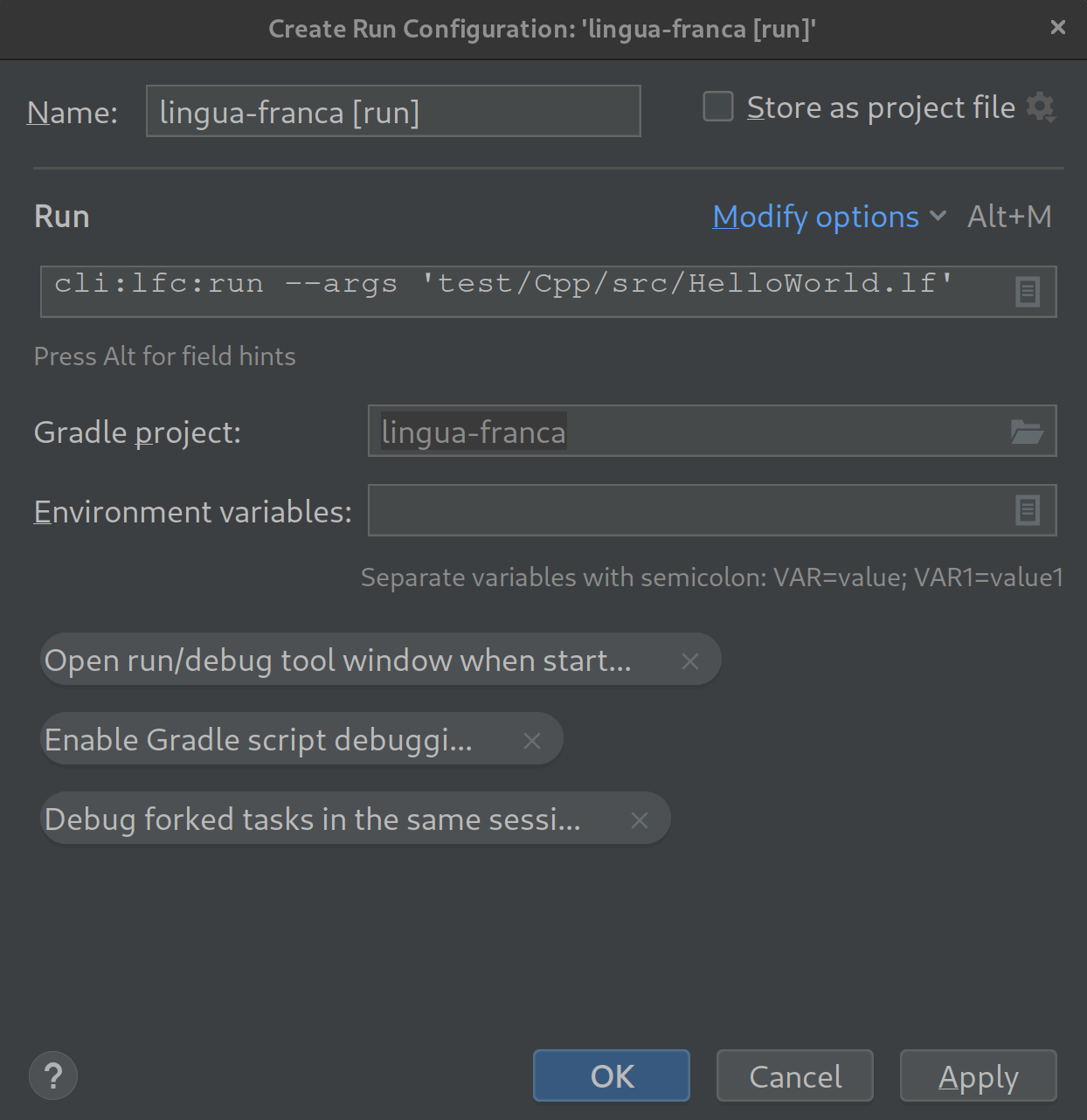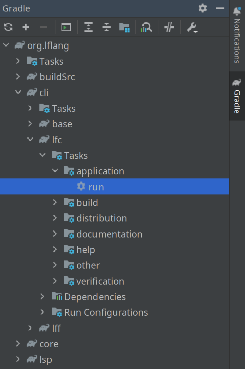 You can set up a run configuration for running and debugging various Gradle tasks from the Gradle tab, including the code generation through lfc. To set up a run configuration for the run task of lfc, expand the application task group under org.lflang > Tasks, right-click on ⚙️ run, and select Modify Run Configuration.... This will create a custom run/debug configuration for you.