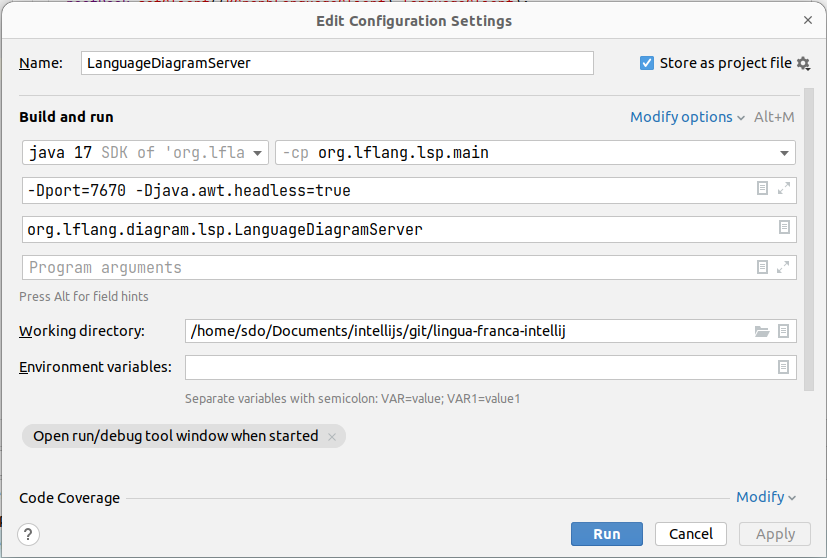 There should a predefined run configuration called LanguageDiagramServer available, which executes the main method the LanguageDiagramServer class, which, as a result, starts the language server.